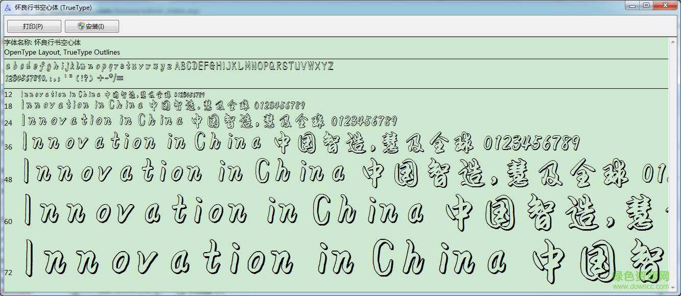 良怀行书空心体是一款非常有特色的行书字体,这款字体行云流水,字体潇洒,帅气张扬,空心字体给人非常具有立体感,非常适用于艺术设计、广告设计等领域。喜欢的朋友们赶紧来绿色资源网下载体验吧!