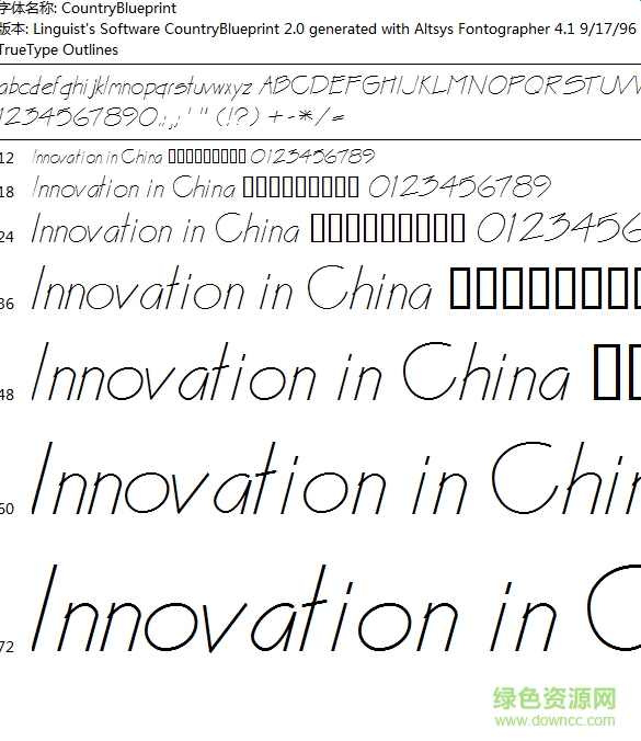 countryblueprint字体是一款很不错的电脑英文字体,字体笔画随意,得体大方,看上的朋友欢迎到绿色资源网下载体验!