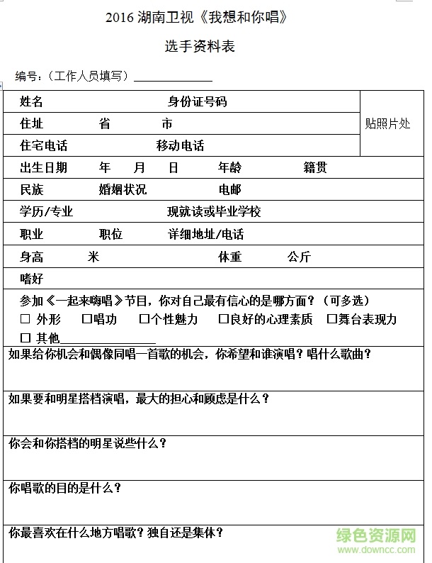 我想和你唱资料表是报名我想和你综艺节目必填资料,不管你是通过网页或手机报名,都需要填写选手报名表,赶紧下载开始报名跟自己喜欢的歌手一起唱吧。