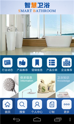 智慧卫浴APP手机客户端是一个专业的卫浴资讯、产品信息交流平台,为您提供最新的行业动态,产品供求,招商等信息。为广大商家提供合作商机,向广大用户推荐最新卫浴产品,让用户在第一时间了解产品流行新风尚;智慧卫浴以便捷的浏览方式,丰富的产品信息、知识动态,为您提供优质服务!