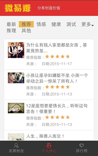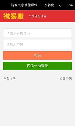 微易赚是一款分享文章可以赚佣金的app!通过分享微分赚提供的搞笑,娱乐,养生,理财,图片,心灵鸡汤知识等内容或者是关注微易赚推荐的微信公众账号,即可获得相应的现金,当现金到达100元就可以通过支付宝提现了。微易赚会员180万覆盖老中青人群,甚至全家出动,大家都在玩微易赚,赶快加入吧!
