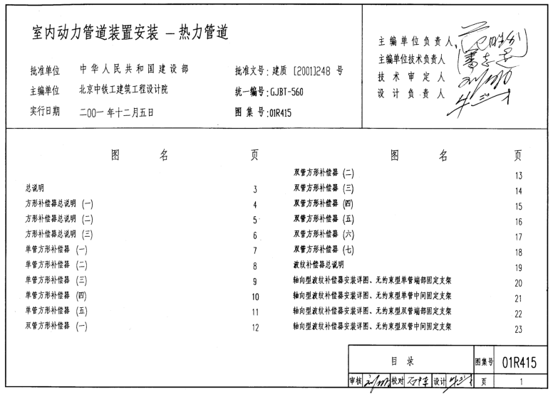 本图集为热力管道安装图集,用于一般工业及民用建筑室内热力管道的设计安装和施工,图集给出热力管道方形、波纹、套筒补偿器三种补偿方式的安装图、选用表及固定支架。