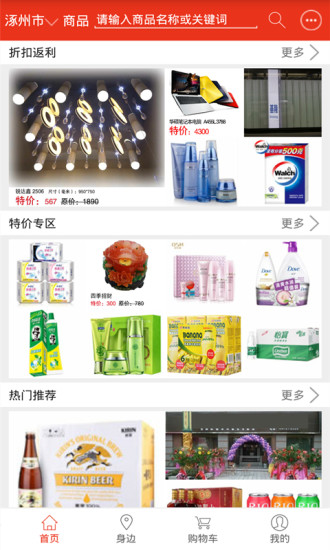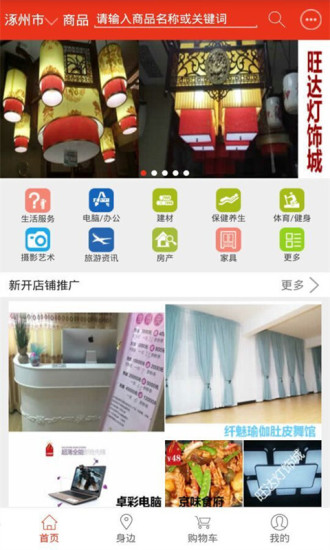 1.可自行根据关键词搜索本区域内的商品和商铺,可查看身边有哪些商铺,可根据行业分类查看商铺和商品等功能。