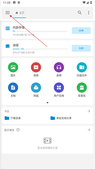 1、打开流舟文件应用,点击界面左上角的菜单按钮。