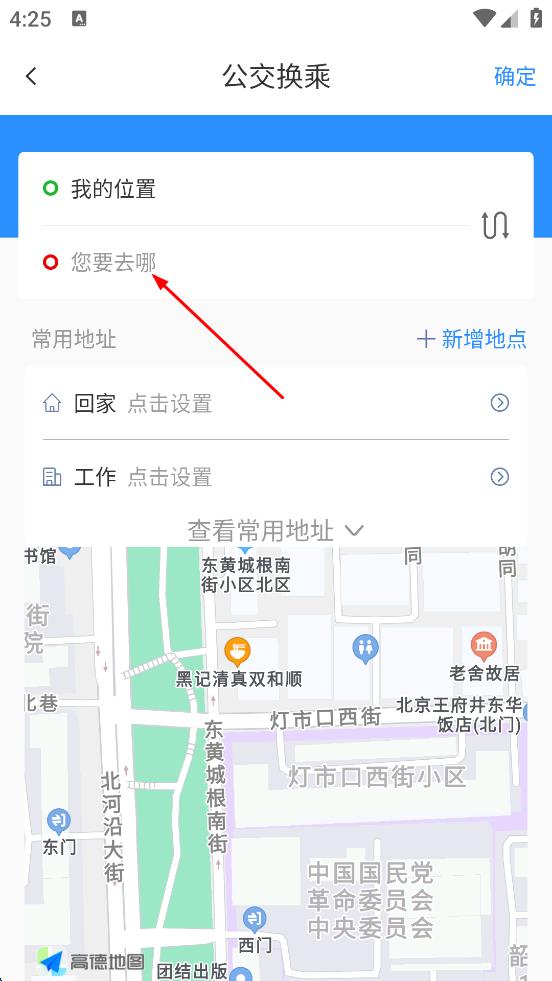 2、在公交换乘页面,先确认“我的位置”,再在“您要去哪”输入框中输入目的地,比如输入“城南”,系统会根据输入的信息进行搜索。