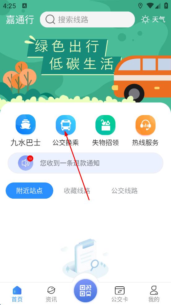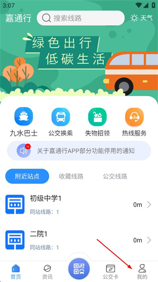 1、打开嘉通行应用首页,查看九水巴士等功能入口及附近站点信息,点击底部我的选项。