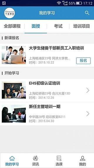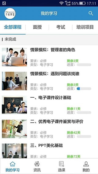 平南云学习客户端为用户提供了丰富多彩的学习资源,包含普通互动性课程、面授课程、课前调研、课后考试以及一整套培训项目集合,供您选课学习,让您体验到全方位的移动学习,动一动拇指即可学习到专业的课程。