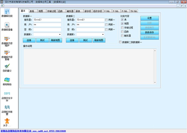 数据库比较工具是一款专门用于对比数据库的工具。通过软件,可以对比出两个数据库间的不同,如:函数、视图、表等,还可以把对比后的结果导成多种格式文档。赶快下载体验吧!