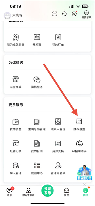 3、在个人界面中,在更多服务列表中,点击推荐设置的选项。