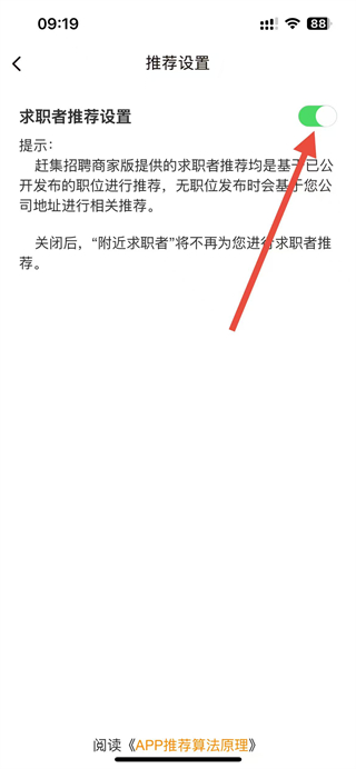 4、在推荐设置页面中,将求职者推荐设置的开关关闭,即可关闭求职者推荐功能。