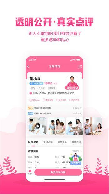 在线筛选专业、可信赖的母婴服务人员。丰富的个人背景资料、形象照片,从业经验一目了然,独有的“一面二审三考四访五训六评”的认证评估体系,仅20%的通过率,只为找到最符合妈妈要求的她。