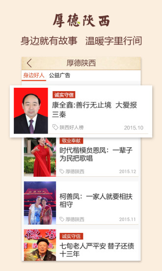 2、厚德陕西app基于新媒体传播下的多种信息承载模式,有效结合了文字、图片、声音、视频等信息载体的优势,独创音频特色栏目,用户可随时随地听新闻、听故事,感受字里行间的温暖。