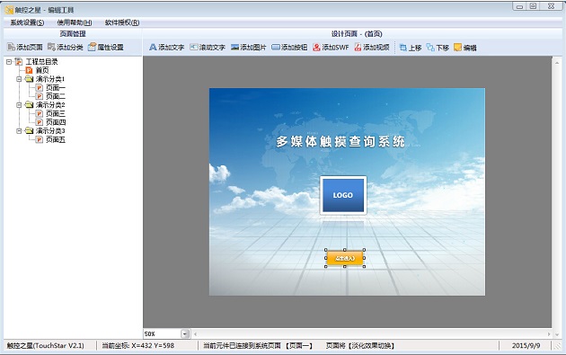 触控之星是一款用来制作触摸查询系统的软件,即便用户不具备专业的计算机知识,利用触控之星依然可以快速的创建一个绚丽的触摸查询系统。同时触控之星还免费提供大量的模版资源,可以帮助用户可大大缩短开发触摸查询系统的日程,提高工作效率。