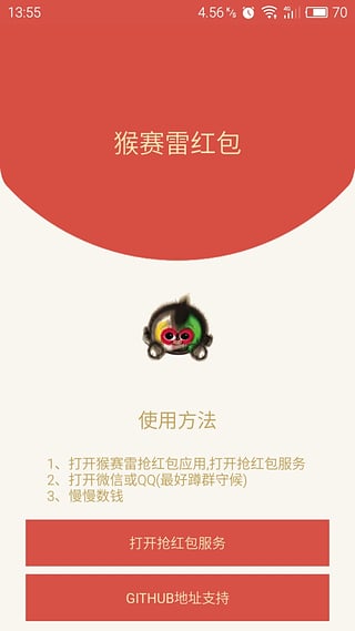 1.打开猴赛雷抢红包应用,打开抢红包服务