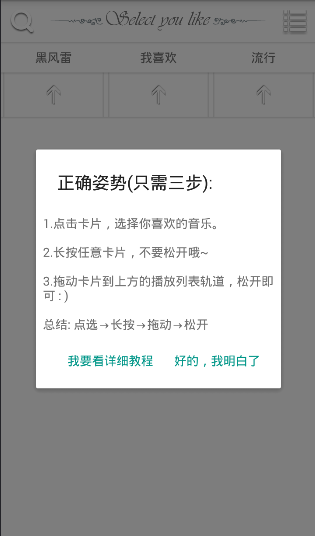整个应用应用了卡片风格,并以卡片的形式实现了选歌。注意:选歌的指示是,进入选择界面,然后点击喜欢的音乐卡片然后长按,拖放到对应的列表即可。
