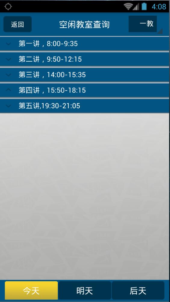 5、空闲教室查询。app自带2013-2014学年教务处空闲教室离线数据库,不联网就可以查询空闲教室。