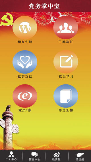 党务掌中宝,即手机版党建红云平台,通过移动客户端的APP模式,将红云平台从计算机延伸到苹果、安卓等主流智能手机上,设有“菊乡先锋、党群互助、党员e家、干部选任、党员学习、思想汇报、用户中心、留言中心、微联盟、漂流瓶”等10个模块,是方便广大党员参与党内活动,方便党务工作者做好党务工作的智能工具。