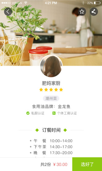 3.用户将可以自由定制专属的菜式、餐盒、口味等,并指定专门的私厨为你下厨,给你带来新鲜有趣的订餐、用餐体验。