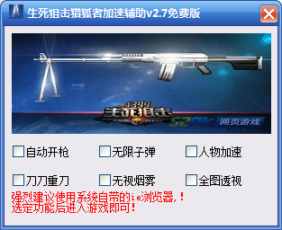游戏介绍 游戏标签: 生死狙击 生死狙击猎狐者加速辅助是专门为页游生死狙击玩家设计的最新游戏辅助工具,为玩家提供自动开枪、无限子弹、人物加速等功能,有需要者欢迎下载~功能介绍人物加速刀刀重刀无视烟雾全图透视自动开枪无限子弹温馨提示该辅助支持IE浏览器,选定功能后用ie浏览器开启游戏.开启辅助前,请关闭所有的杀毒软件,或者将软件添加白名单 辅助采集自网络,本站不保证辅助正常可用,如果涉及收费问题,请斟酌处理,警防上当受骗!(解压密码:www.downcc.com) 游戏截图 上一张下一张(1 / 1) 安装详细截图 猜你喜欢 生死狙击辅助 生死狙击辅助 生死狙击是由无端科技开发,4399发行运营的一款3D第一人称射击(FPS)游戏。相信大家在玩游戏时,总是会觉得武器没别人的好,现在不用担心了,绿色资源网为大家提供一些专门的生死狙击刷枪软件,及修改器、辅助等,帮助大家刷到极品枪支,如果觉得打不过对手,还可以用修改器和辅助帮你! 查看更多>> 生死狙击雪豹刷枪修改器 1.48M/中文/2.5/v0.8 绿色版下载 阿帅生死狙击刷枪刷金币透视辅助 1.50M/中文/6.3/免费版下载 生死狙击幻影刷枪软件 1.45M/中文/6.0/v0.3 绿色免费版下载 若枫生死狙击刷枪软件 1.45M/中文/5.0/v0.1 绿色版下载 生死狙击陌路透视修改器 1.33M/中文/5.0/v1.7 绿色免费版下载 生死狙击紫影辅助 3.53M/中文/10.0/v1.6 绿色免费版下载 其他版本下载 标题 大小 更新日期 下载 下载地址 电脑版 生死狙击猎狐者加速辅助 V2.7 绿色免费版 点击报错 软件无法下载或下载后无法使用,请点击报错,谢谢! 关闭报错反馈 请描述您所遇到的错误,我们将尽快予以修正,谢谢! *必填项,请输入内容 本类最新 游戏加加pc版 v5.3.2439.909 官方最新版 洛克王国悟空神辅助最新版 v2.3.9.9 官方版 我的世界hmcl启动器 v3.5.5 最新版 悟空神辅最新版 v2.3.7.9 官方版 cf活动一键领取 v5.8.5 官方免费版 4399洛克王国东哥辅助最新版 v13.14 全能版 用户评论 热门评论 最新评论 发表评论 查看所有评论(0) 昵称: 请不要评论无意义或脏话,我们所有评论会有人工审核. 字数: 0/500 (您的评论需要经过审核才能显示)