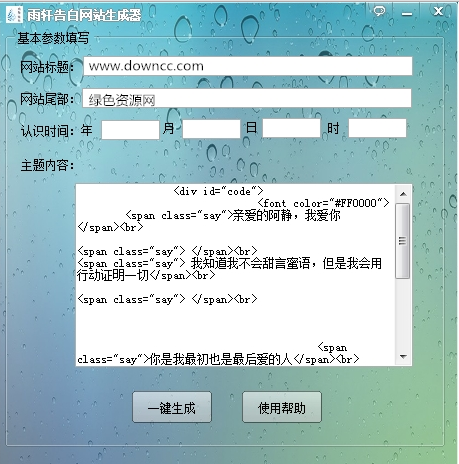 雨轩告白网站生成器是一款非常简单好用的告白网站生成软件,无需复杂的程序,你只需要输入相关的内容和标题即可一键生成,方便快捷,非常有特色的一种告白方式,想要告白的朋友赶快来绿色资源网下载体验吧!