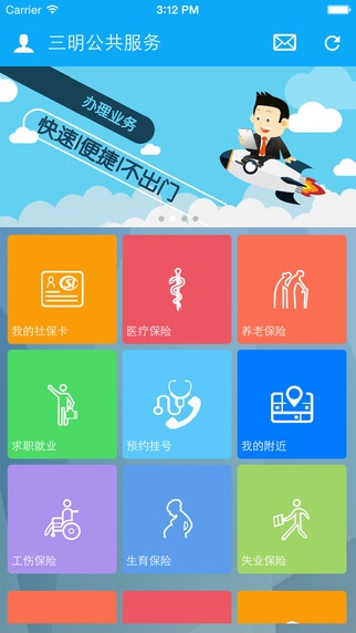 我的社保卡、医疗保险、养老保险、求职就业、预约挂号、我的附近、工伤保险、生育保险、失业保险等
