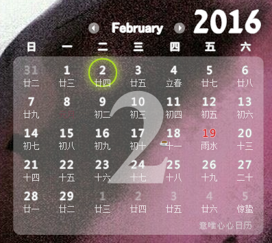 意唯心心日历是由意唯软件推出的一款桌面日历应用,用户可以通过电脑屏幕查看日历,还支持在日历上面进行编辑记事,非常的好用,欢迎需要的朋友来绿色资源网下载体验吧!