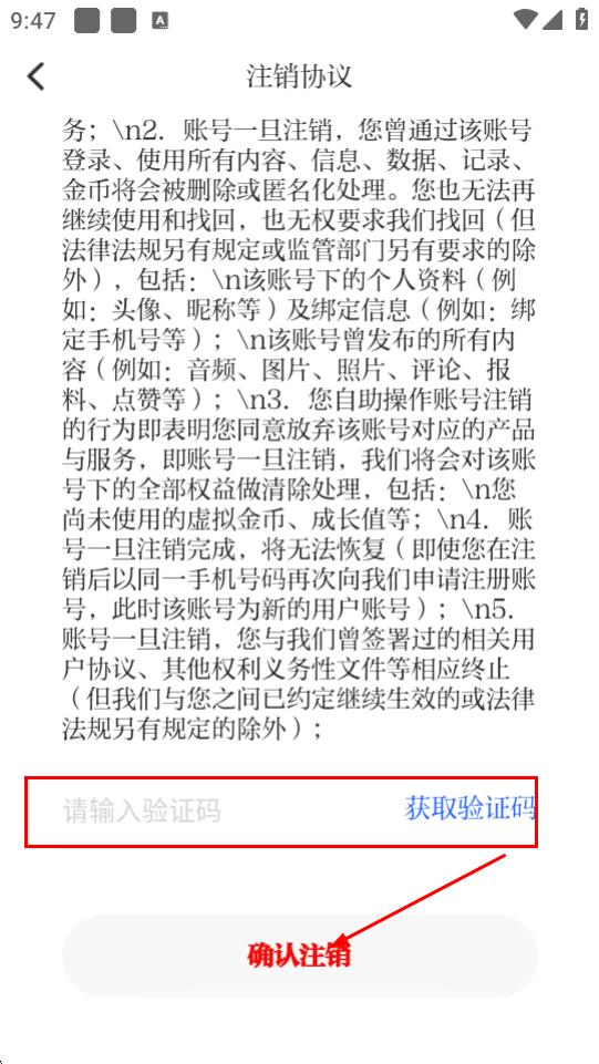 5、阅读注销协议后,获取并输入验证码,点击确认注销完成账号注销申请。