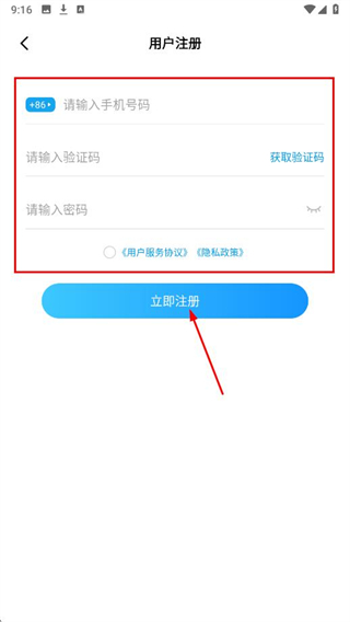 3、输入手机号码,填入验证码,设置密码,勾选服务协议,点击立即注册。