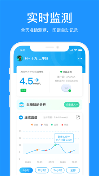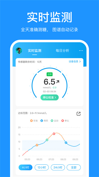 1.通过低功耗蓝牙接收设备的血糖信息。