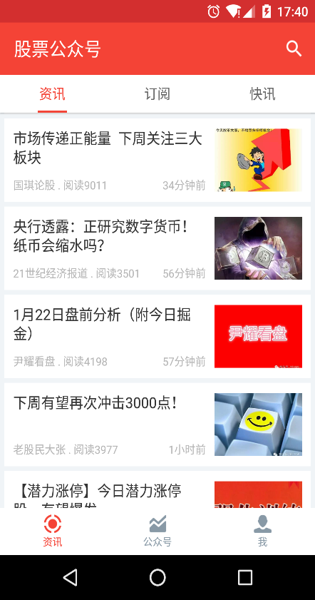 股票公众号app是一款股票资讯类手机软件,这里含有最靠谱的公众号,每天为您带来最新鲜最前沿的股票资讯,牛人为您解读最新行情,专业解读,让你实时掌握股市最新动向,喜爱的朋友赶快到绿色资源网下载体验吧!