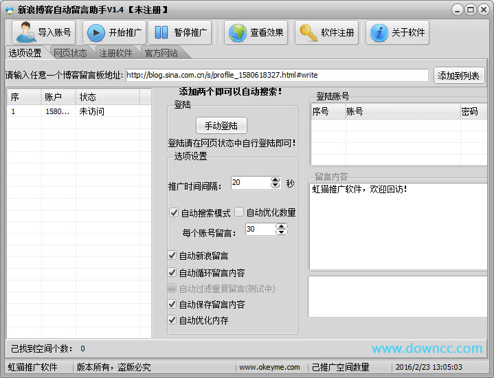 南极新浪博客自动留言助手是一款可以自动在博客上留言的小工具!可以自动搜索博客地址,支持支持单个账号添加和批量导入账号数据,非常适用于淘宝卖家使用!有助于提高店铺的宣传力!欢迎用户来绿色资源网下载使用!