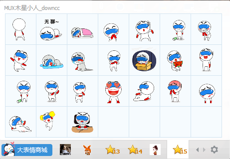 MUX木星小人表情包是一款非常可爱的qq表情包,小编为大家整理了木星小人踢走、吃瓜、对不起、有办法了、飞吻、脸红、嘚瑟 打瞌睡、加油、晚安、悠闲、谢谢、凄凉、抽烟、扭屁股、嘲笑、嗨起来等表情,喜爱的朋友赶快到绿色资源网下载使用吧!