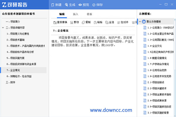 可研报告自动生成软件是一款专业、权威的可研报告自动生成工具,海量模板与案例,素材编辑与积累键,一键导出Word格式报告,简化企业工作。内置高度专业的项目立项报告、资金申请报告等模版、海量成功案例,帮您快速、深度编制可研报告,可以自由编辑报告内容,一键导出Word格式报告,简化企业工作。本软件集成于政和通PC客户端中,下载客户端既可使用本软件!