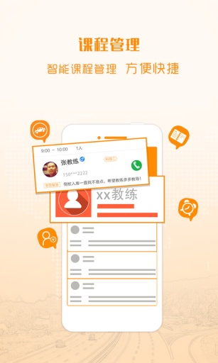 课程设置:个性化设置课程表。教练可根据自身时间安排和课程排期情况,设置课程表,随时更新、发布 。