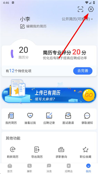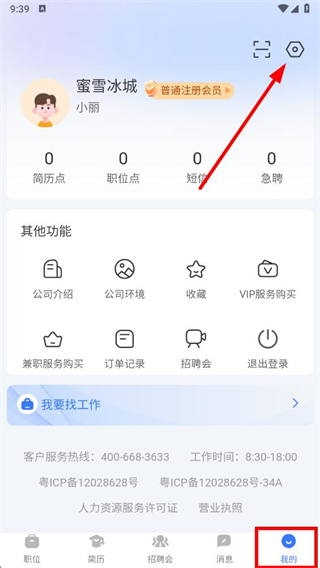 1、打开俊才网app,在我的页面点击右上角的设置图标,进入设置页面。