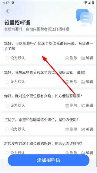 4、在设置招呼语页面可选择已有招呼语编辑、删除或设为默认,也可添加新招呼语。