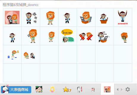 程序猿攻城狮表情包是一款非常搞笑的卡通形象表情包,把程序猿和攻城狮用非常形象的用猿和狮子表现出来,小编为大家整理了bug、bug、bug、怪我咯、妥妥的、约吗、赞等表情,欢迎喜爱的朋友到绿色资源网下载使用!