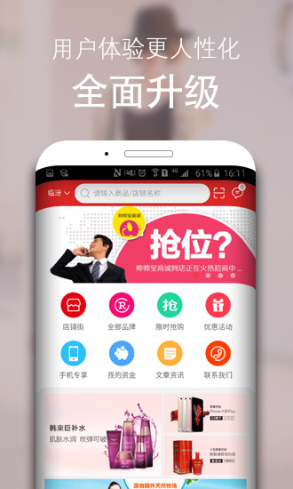帅帅宝,随时随地购遍临汾。帅帅宝商城,国内区域化综合大型b2b2C网购平台,综合性购物平台。2000个品类,10000个品牌,100%正品保障,全新一站式购物体验。 涵盖食品饮料、服饰鞋包、美妆护肤、家电数码、时尚大牌等品类,提供优质的品牌商品和服务,为你提供潮流购物生活体验。帅帅宝商城(Android版)是福象帅帅旗下专为手机打造的时尚购物应用。