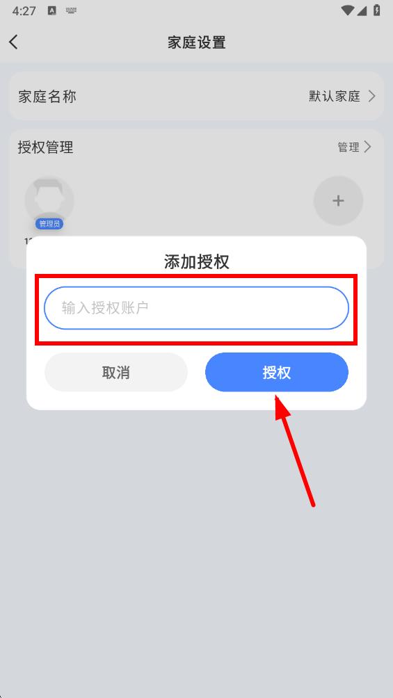 5、在弹出的添加授权窗口中,输入要授权的账户,然后点击授权,即可完成家庭成员添加。