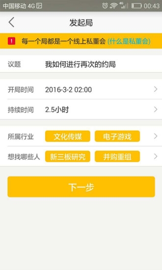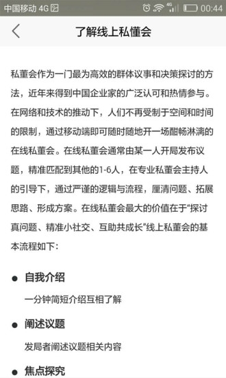 约局打破传统的咨询服务模式,通过互联网的方式实现企业决策智慧和经验的共享,用户参与约局的最大价值是:探讨真问题,协同共成长,精准小社交。作为线上私董会领导者,实名用户可随时发出自己的困惑及议题,通过精准匹配完成组局。以私董会模式确保议题探讨的聚焦与深度,用手机在线会议的形式大大降低用户的时间成本。