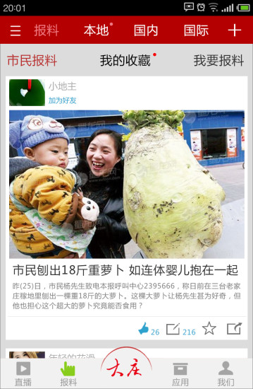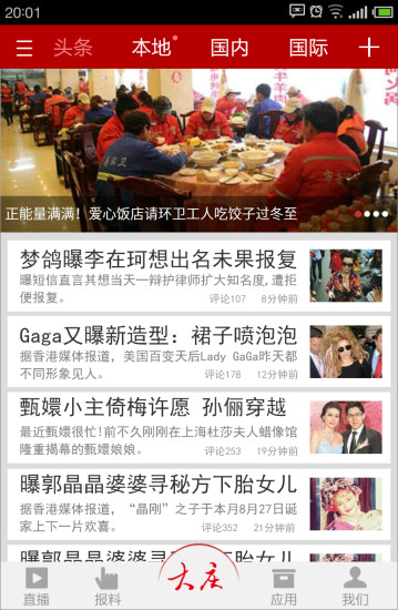 底部含有:直播、报料、应用和我们供我们使用。