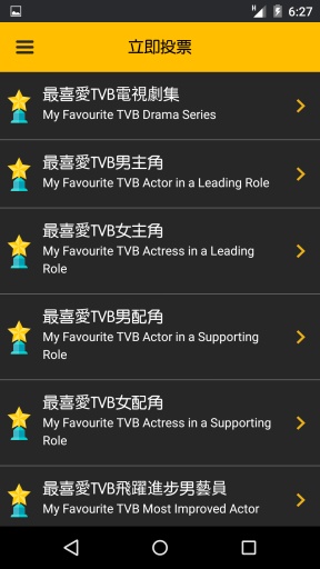 电视迷由10月16日起至11月21日可透过流动应用程式,亲自投选心目中最喜爱的剧集、角色、歌曲及综艺节目等多个奖项。本年度各奖项共设有13个入围奖项类别,其中包括「最喜爱TVB电视剧集」、「最喜爱TVB男主角」、「最喜爱TVB女主角」、「最喜爱TVB男配角」、「最喜爱TVB女配角」、「最喜爱TVB飞跃进步男艺员」、「最喜爱TVB飞跃进步女艺员」、「最喜爱TVB萤幕情侣」、「最喜爱TVB剧集歌曲」、「最喜爱TVB电视角色」、「最喜爱TVB综艺节目」、「最喜爱TVB资讯节目」及「最喜爱TVB节目主持」。各个奖项最终花落谁家?全凭观众手上一票!完成投票更有机会赢取颁奖典礼门票两张及其他丰富奖品。