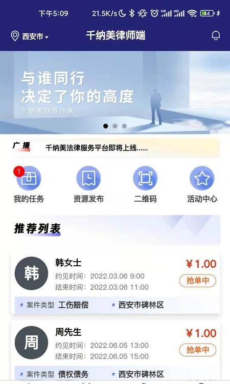 认证极快:上传法律从业资格证或律师执业证即可注册为平台律师,开始接单,获得高收入。