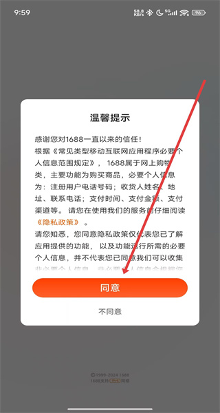 1、打开1688APP,弹出“温馨提示”窗口,点击“同意”。
