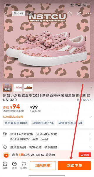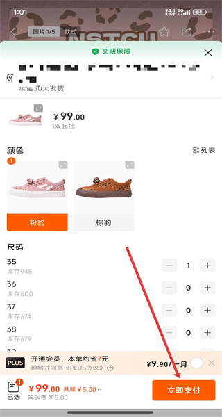 4、在订单确认页面选择鞋子颜色、尺码等信息,点击“立即支付”,完成商品购买操作。