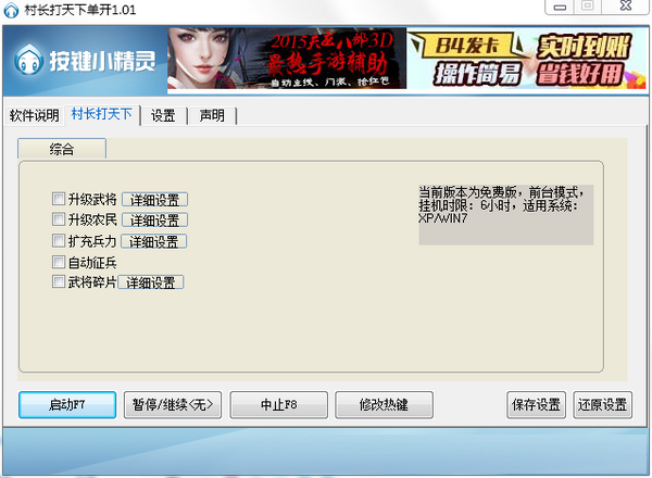 村长打天下单开辅助是专门为4399页游村长打天下玩家制作的游戏辅助工具,为玩家提供自动升级武将、农民、扩充兵力等,通过此辅助可以快速让玩家体验游戏的乐趣,有需要者欢迎下载!