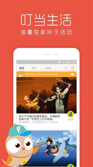 1.品质活动:叮当派为大家寻找、筛选众多高品质独家活动,让孩子释放天性,家人共度温馨亲子时光。艺术展览、儿童剧院、自然博物馆、橄榄球、沙画、非洲鼓、暴走徒步、亲子跑团、牙医、烘焙等,总有一类活动能让你和孩子乐享周末。