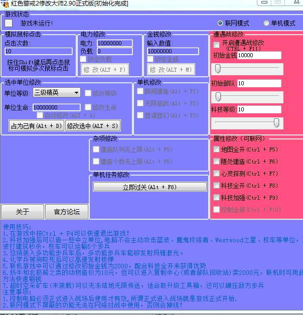红警修改大师是一款红警辅助工具,这个在玩家界还是比较有名气的,目前最新版本2.90。你可以使用该工具对红色警戒2、共和国之辉、尤里的复仇及反恐联盟、心灵终结、神龙天舞等版本进行各项修改。其中部分功能支持联机,如地图全开等。