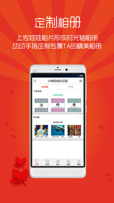 2. 成长相册:上传娃娃的照片保存在云端形成时光轴相册,定制娃娃的专属精美相册并一键分享给亲友。