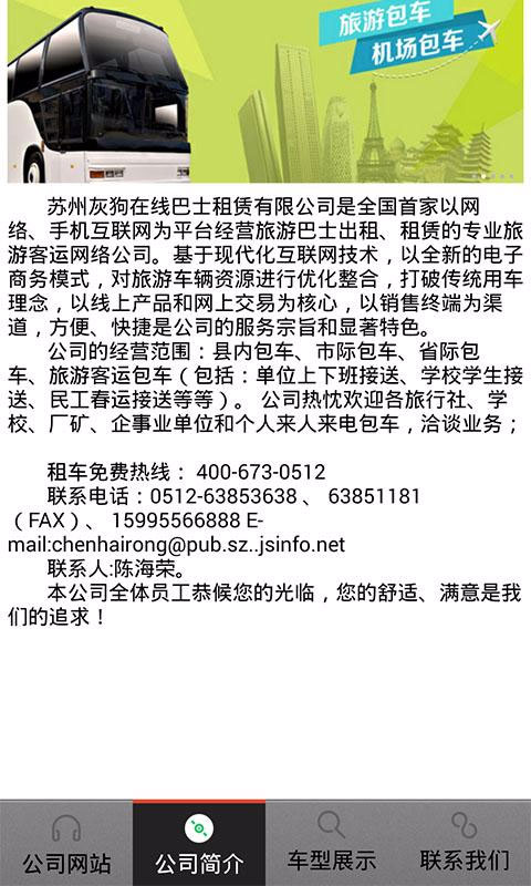苏州灰狗在线巴士租赁有限公司是全国首家以网络、手机互联网为平台经营旅游巴士出租、租赁的专业旅游客运网络公司。